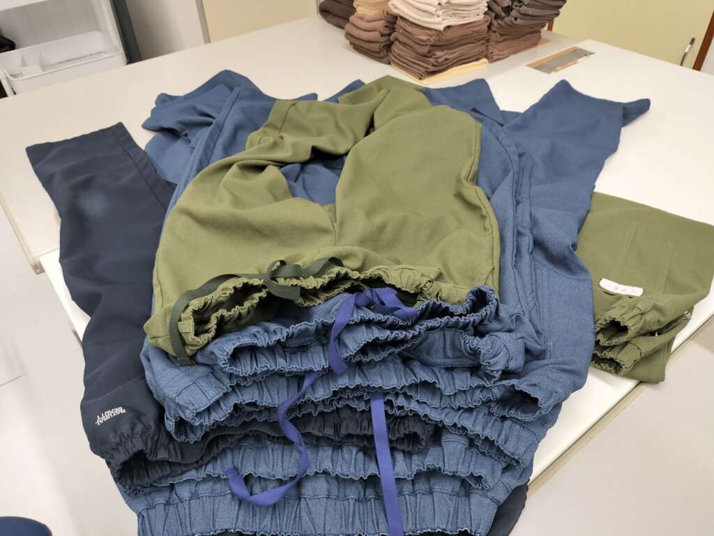 乾燥後は一度すべて広げてから手で丁寧にたたむことで、上下セットがそのままスタッフ様にすぐご利用いただける状態で納品。洗濯代行 スクラブとして、利便性を重視した仕上げを行っています。