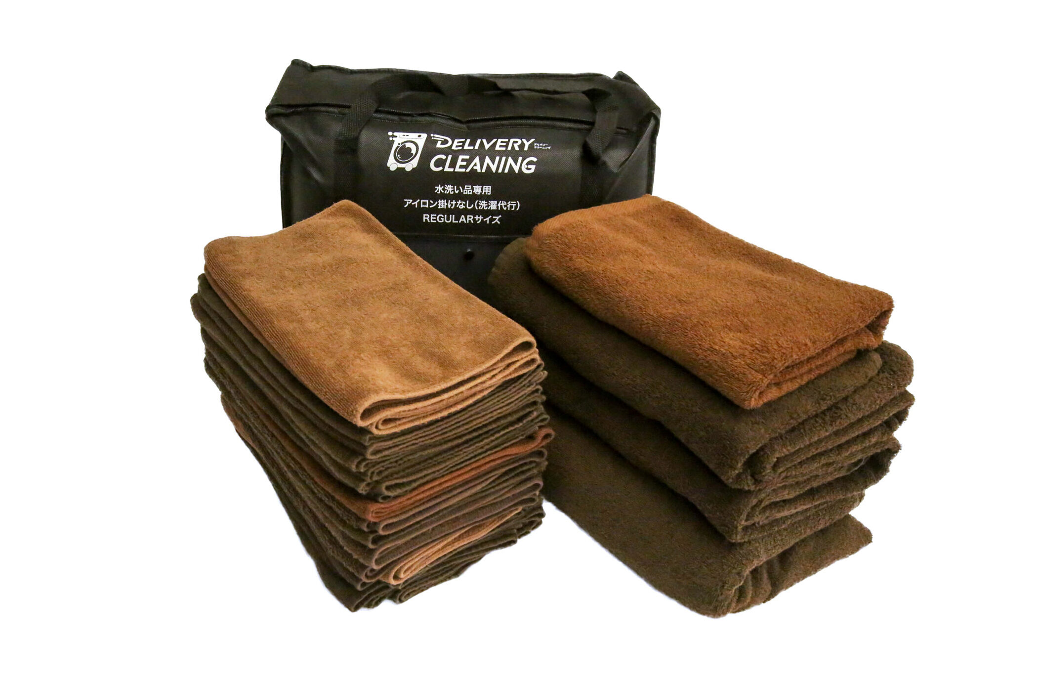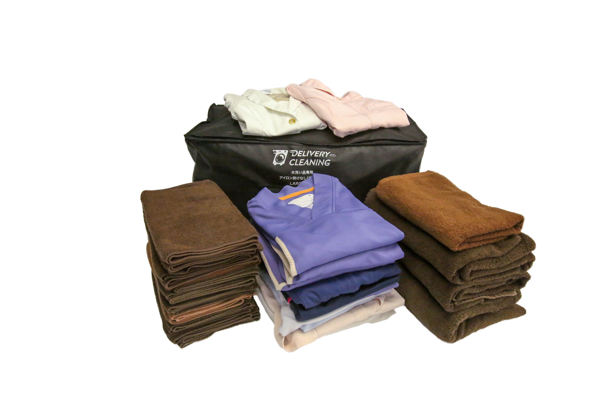 一方、洗濯代行ならランドリーバッグ単位の料金。バッグにタオルを詰め込むだけなので、1枚あたりの単価は圧倒的に安くなります。デリバリークリーニングのMサイズ(45L)ならフェイスタオル30〜40枚は入るので、1枚あたり数十円の計算です。